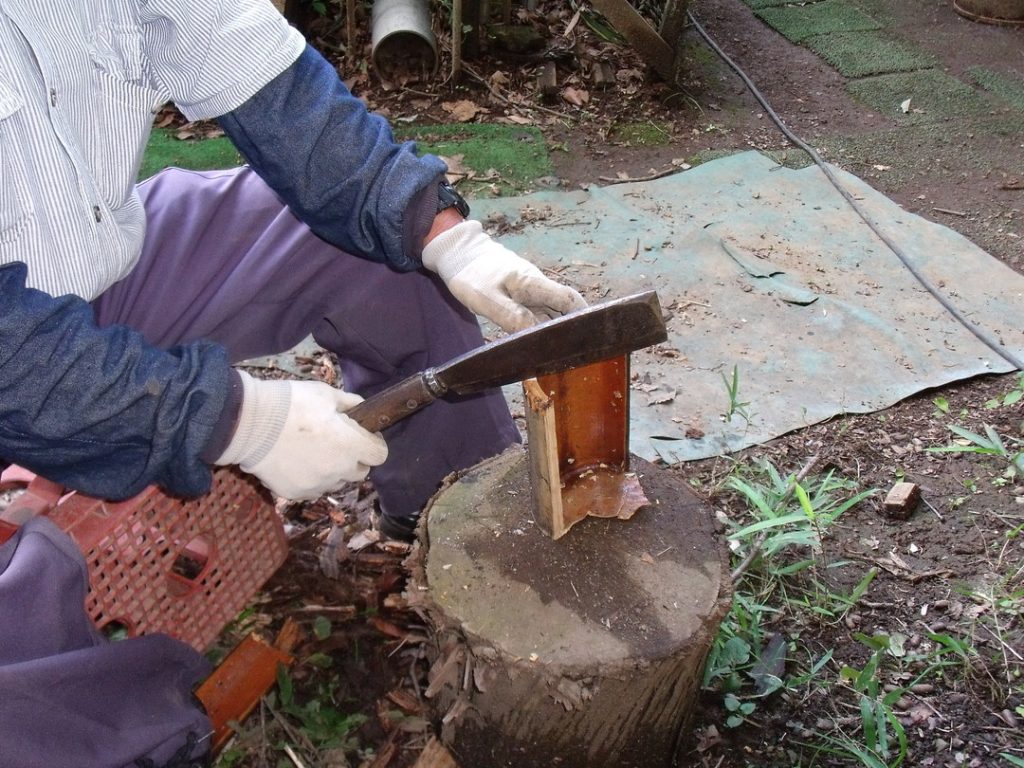 さらに、ナタで適切な幅に切り分け、灯油を燃やす熱で、竹炭をいぶし、水分を蒸発させます。