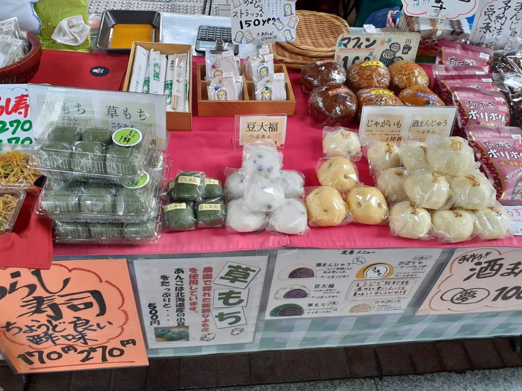 酒まんや、豆大福、草もち、じゃがまんなどがあり、中でも粒あんの酒まんじゅうや草もちが人気です。